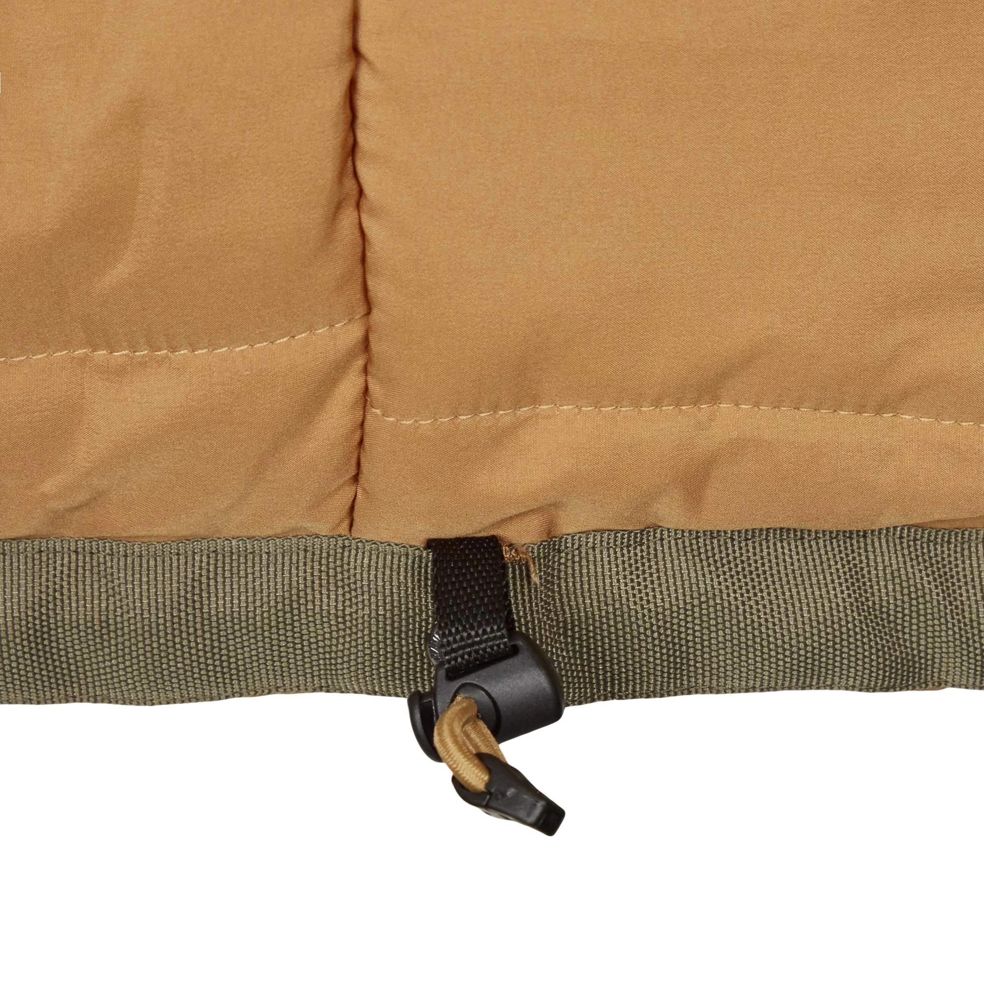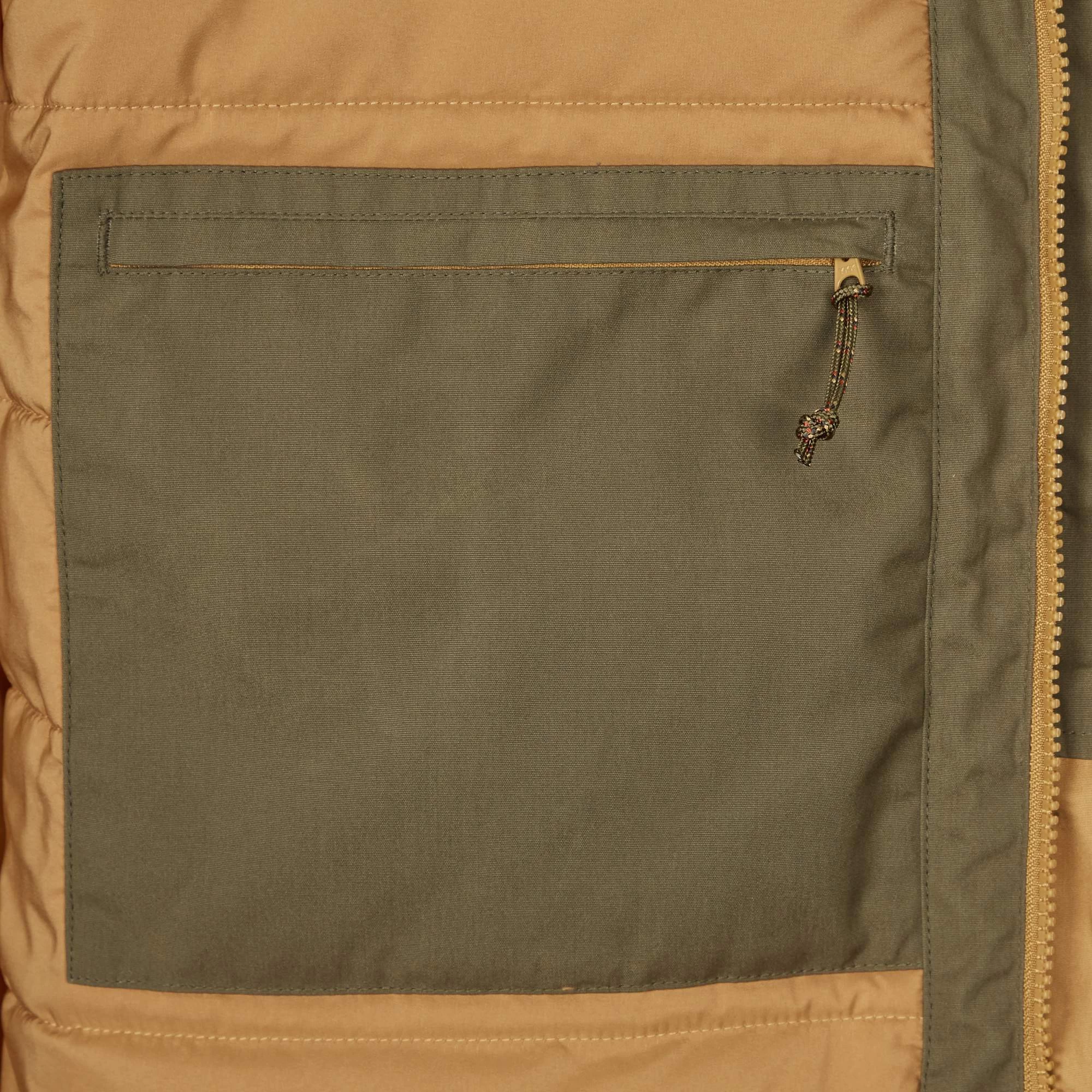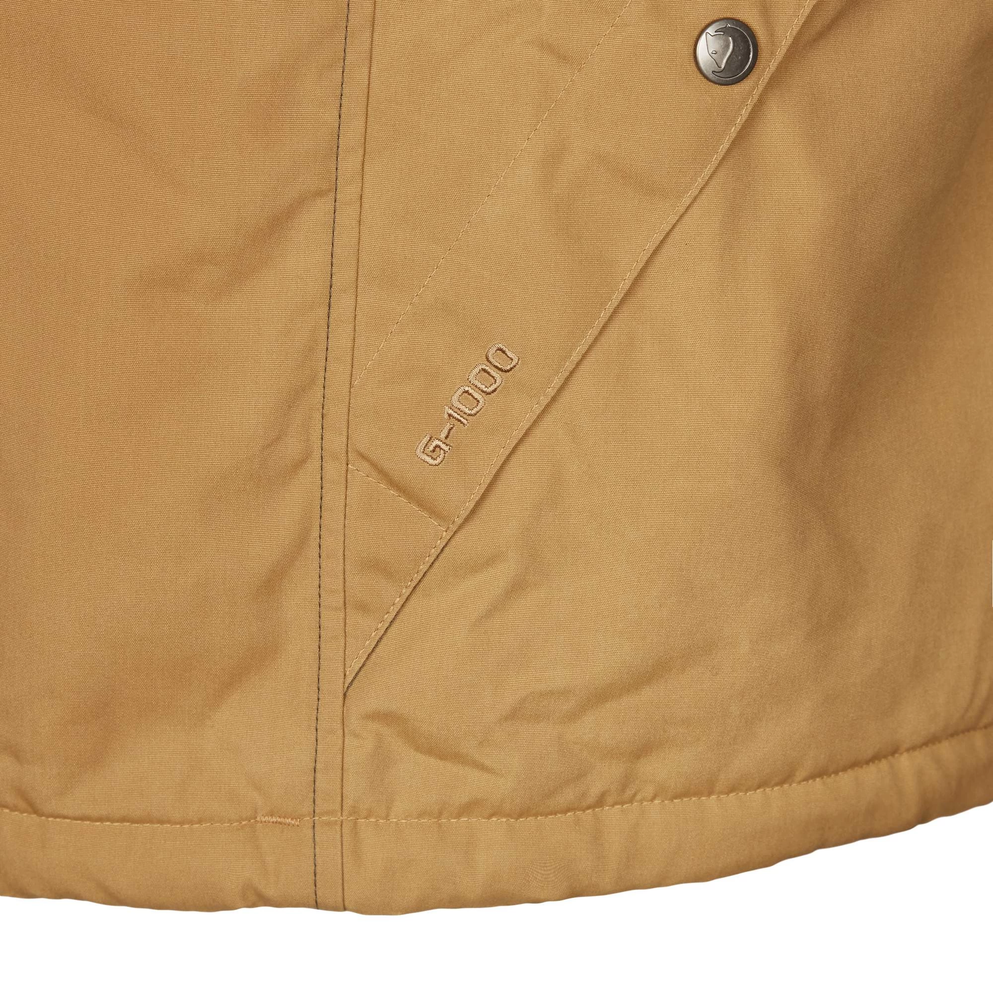 Als Obermaterial kommt G-1000 Eco zum Einsatz. Wie der Name schon erahnen lässt, handelt es sich hierbei um nachhaltiges Material. Der Kunstfaseranteil besteht aus recyceltem Material, die Baumwolle stammt aus kontrolliert biologischem Anbau. Das G-1000 Obermaterial ist außerdem mit speziellem Wachs behandelt, was die Jacke wasserabweisend macht. Diese spezielle Imprägnierung wäscht sich mit der Zeit heraus und sollte daher von Zeit zu Zeit erneuert werden. Entsprechend deiner persönlichen Vorlieben kannst du viel oder weniger Wachs verwenden.