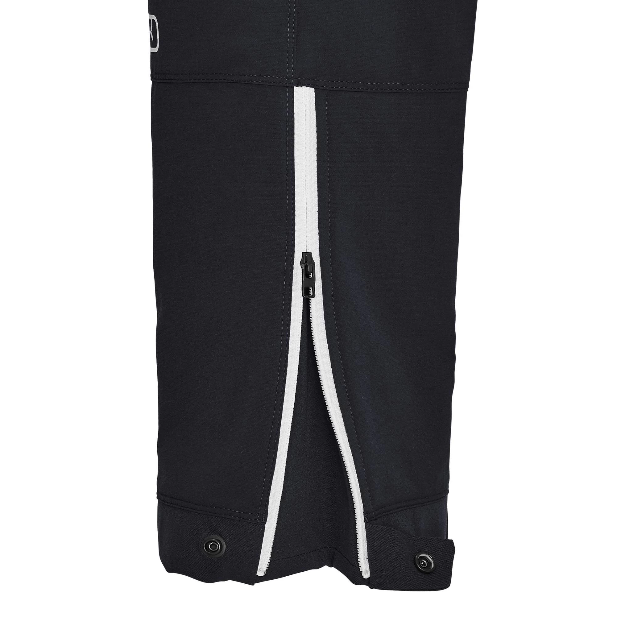 Damit auch von unten kein Schnee eindringen kann, schließen die verborgenen Gamaschen die Hosenbeine über den Skistiefeln sicher ab. Die Hosenbeine sind im unteren Bereich auf der Innenseite zudem abriebfest verstärkt, um einen versehentlichen Kontakt mit den scharfen Stahlkanten der Skier möglichst unbeschadet zu überstehen.